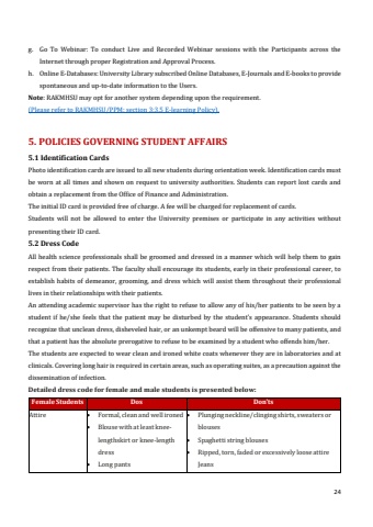 183. STUDENTS%u2019 RIGHTS AND RESPONSIBILITIES3.1 Students%u2019 Rights andResponsibilitiesFor the university to function as a harmonious unit, certain guidelines have been established to coordinate and facilitate internal interaction. This handbook outlines the rights, freedoms, and responsibilities of all students at RAKMHSU.Besides clarifying these special rights and responsibilities, this handbook sets out the means by which violation of these rights and responsibilities will be treated by the University.RAKMHSU facilitates the transmission of knowledge, the progress of students and improvement of society. Students at RAKMHSU are encouraged to develop the capacity for critical thinking, engagement in an independent search for truth, developing maturity in moral and social behavior as well as the cultivation of intellectual excellence. Students are guaranteed the privilege of exercising certain rights without fear of prejudice i.e. the pursuit of educational goals and learning opportunities within the curricula of the College and within the resources of the College, provided such actions do not interfere with the rights of others or the effective operation of the institution. The behavior of the students as a group creates the environment within which each student, faculty member and administrator, lives and works. The patterns of student attitudes and behavior determine the character of the entire community and the prestige of RAKMHSU as an Educational institution. Concerning creating a facilitatory, conducive and scholarly environment decrees that the students must be guided by a set standard of rights and responsibilities. It is with this point in mind RAKMHSU affirms basic standards of behavior that cannot be disregarded by the enrolled students. Any behavior which seriously affects the academic performance of the student or of fellow students, which offends the sensibilities of others (whether students, faculty members or visitors), or which causes damage to the property of the College or of individuals will result in disciplinary action. RAKMHSU students are required at all times to show due respect and courtesy, orderly conduct and compliance with the Institutional rules and regulations. (Please refer to RAKMHSU/PPM; section 6:6.15 Students Rights and Responsibilities Policy).3.2 Academic FreedomIntellectual development is best fostered in an atmosphere of active engagement in the educational process, and therefore, free discussion, free inquiry and free expression regarding issues within the domain of the course or program are encouraged.3.3 Evaluation%u2022Students are evaluated on the basis of their academic and clinical performance.