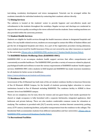346.1.5 Crisis Intervention AssistanceThe Counseling Center provides crisis intervention assistance to the students who are experiencing crises which affect their ability to function in the community.6.1.6 Booking an AppointmentStudents can schedule a counseling appointment via the Student Portal, university email, or by visiting the Counseling Office in person. All sessions are confidential and tailored to support students%u2019 academic, emotional, or social concerns.6.1.7 Online Counseling SessionsTo ensure flexibility and inclusivity, the Counseling Department provides online sessions through secure platforms (e.g., MS Teams or Zoom). These sessions follow the same confidentiality and ethical standards as in-person meetings.6.1.8 Self-Initiated Walk-In SupportStudents may access self-initiated (walk-in) sessions during designated hours without prior booking. This service offers prompt psychological assistance, guidance, or emotional containment when immediate support is needed.6.1.9 Smart Counseling Services (Digital & Self-Guided Support)The Counseling Service is committed to innovation through Smart Services that provide digital, accessible, and student-centered support.These include self-assessment tools, smart scheduling systems, and AI-assisted recommendations available through iPads or secure online platforms.Smart services empower students to monitor their emotional wellbeing and access timely support independently and confidentially. (Please refer to RAKMHSU/PPM; section 6:6.16 Student Counseling Policy).University Student Emergency Hotline (For Any Urgent Help)A dedicated hotline is available for any emergency situations faced by students, whether psychological, academic, social, or related to personal safety.The Counseling Department coordinates with relevant units to provide immediate guidance, emotional support, or referrals when needed.Students should use this hotline only in urgent cases to ensure priority response.(Hotline details are available on the Student Portal and official university platforms.6.2 Career Counseling and Career PlanningRAKMHSU provides career services to undergraduates and contributes towards making RAKMHSU graduates develop clarity of purpose and appropriate decision-making abilities, so that students will be confident, selective, and competitive in managing their careers and further academic pursuits. The