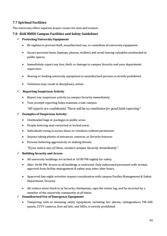 37%u2022Support university standards of competent advising%u2022Support students%u2019 development of decision-making skills.%u2022Reinforce student direction.%u2022The primary purpose of academic advising is to provide effective guidance so that students can maximize the educational opportunities available at RAKMHSU and make critical decisions regarding education, career, and life goals.6.3.5Advisor%u2019s Roles and Responsibilities%u2022Be available to advisees through appointments, either by regular individual or group meetings, via email, and/or via phone or other established means of communication.%u2022Offer advisees opportunities to meet for discussion of their educational experiences by helping them to learn how to make practical academic plans and decisions.%u2022Provide accurate information about program requirements, RAKMHSU policies, and resources etc.%u2022Provide advisees with general and departmental requirements, college regulations, services and opportunities.%u2022Help advisees understand the relationship of past educational achievements to their present and future educational goals.%u2022Ensure students are knowledgeable about advisor/advisee responsibilities.%u2022Maintain confidentiality of students%u2019 records when applicable.%u2022Maintain accurate documentation of all advising sessions.6.3.6Advisees Roles and Responsibilities%u2022Take responsibility for educational experience.%u2022Learn how to access and use University email, UMS, and any other online student success platforms.%u2022Read RAKMHSU emails on a regular basis.%u2022Become familiar with and use campus resources;%u2022Maintain contact with assigned advisor throughout the semester.%u2022Attend each advising appointment prepared, to ask questions and discuss concerns.%u2022Use the Student Catalog and other resources to become knowledgeable of academic requirements, policies, and procedures.%u2022Know important dates and deadlines (registration, drop, final exams, etc.) as listed on the University%u2019s Academic Calendar.6.3.7Academic Advising Process at RAKMHSUSuccessful Academic Advising depends on the ability of the Advisor and Advisee to recognize the nature of the Academic Advising process, and together be responsible in the Advising process. Advisors are the interpreters who help students navigate through their university journey. As such, advising can be viewed as a way to connect students to the University and help them feel that someone who is their well-wisher, is