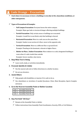 477.8.3 Emergency Response Team%u2713In the event of an emergency or incident:%u2022Immediately alert your designated Floor Warden or the nearest Security officer.%u2022Follow all instructions from the Emergency Response Team, Floor Wardens, and Security personnel.%u2022Do not use elevators during fire alarms or evacuations, always use stairways.%u2022Assist individuals with disabilities or anyone needing help during evacuation, if it is safe to do so.%u2022Familiarize yourself with your nearest emergency exits, Assembly Point, and evacuation routes.ERT Roles and Responsibilities:Team RoleResponsibilitiesEvacuation CoordinatorsCall the ambulance and civil defense when required.-Communicate with fire wardens to track evacuation progress.-Monitor and provide updates to observers and relevant authorities.Security StaffControl vehicle and pedestrian traffic to prevent congestion near exits and assembly point.-Prevent unauthorized re-entry during drills and emergencies.Assembly Point CoordinatorsConduct headcounts using attendance sheets.-Report missing individuals or discrepancies to the evacuation coordinator.Fire RespondersRespond to fire emergencies and use extinguishers only when safe.-Coordinate with civil defence upon their arrival and provide relevant information.Fire Wardens-Conduct final sweeps of their assigned areas to ensure no one is left behind.Close doors to contain fire and limit its spread.Medical / First Aiders-Provide first aid for injuries.Coordinate with assembly point coordinators to handle medical emergencies.Tip:Know who your Floor Warden is and where their office or classroom is located.This will help you get quick guidance during an emergency.
