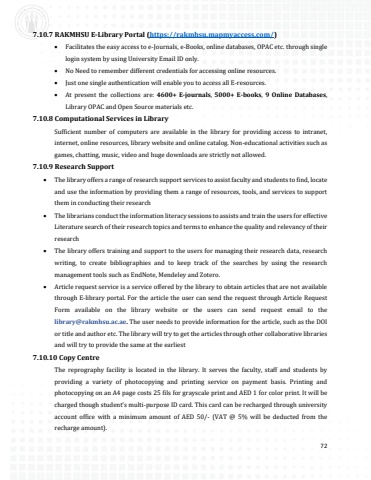 66managed by the Central Library, provide convenient access to essential books, e-journals, and digital resources for clinical students and adjunct faculty%u2014ensuring uninterrupted academic support across all locations.7.10.1 Rules and Regulations for the Library Users%u2022All users must follow the library guidelines strictly.%u2022Readers and visitors are requested not to bring their bags inside the library. Adequate storage facility is provided at the entrance of the library to keep their bags.%u2022Silence and discipline must be maintained in the library premises.%u2022Every student must possess their identity card while making use of the library.%u2022For any group studies, kindly use the dedicated Group Discussion Rooms. This will help to maintain silence in the quiet study area.%u2022Use of eatables in the library is strictly prohibited. Utmost care should be taken by all to keep the library clean.%u2022For the books referred in the library, the users are requested not to shelf those books; just leave it on the tables, the library staff will reshelf it%u2022Photocopy service is available only for Library material against payment through their multipurpose university ID Card which can be recharged from the account%u2019s office.%u2022To avoid the violation of the Copyright Law only 10% of a book is allowed to be photocopied.%u2022Students are required to handle the books and reading material very carefully. Marking library books with pencil or ink, tearing the pages or spoiling the same is strictly prohibited.%u2022Maximum of 4 books will be issued to one reader for 14 days only. Maximum 2 renewals of 14 days each are allowed if user wants to keep the books for more time.%u2022No renewal will be allowed if the books is already reserved by other user.