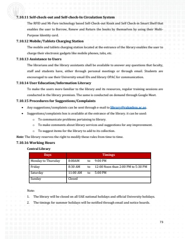67%u2022Newspaper and Magazines will not be issued and can only be consulted for reading within the library premises.%u2022Books for TBL will be issued for specific time and the same must be returned immediately.%u2022Reference material will not be issued for any reason.%u2022The fines on overdue will be calculated according to library policy and the user has to follow it.%u2022Users have to take care of their belongings. The library is not responsible for the loss or misplacement of their personal belongings.%u2022All overdue fines (if any) must be settled before taking any NO DUES Certificate from the library. Failing to which the Examination Ticket will not be issued.%u2022Please try to make all communication for any Library purpose through University E-Mail IDs only.%u2022User are requested not to displace the seating arrangement.7.10.2 Services%u2022Reference Services: Providing assistance to the users to search and get their desired information necessary for their academic and research need.%u2022Reprographic Services: Providing print, photocopy and scanning services through an automated printing system by using your RFID based University ID Card.%u2022Satellite Libraries: At Fujairah, RAKCODS and Omran Hospital.%u2022E-Library Portal: Providing Oncampus and off campus easy access to EBSCO EBooks, UpToDate, ClinicalKey, AMBOSS, SCOPUS, CINAHL Ultimate, UpToDate Lexidrug, Medline Ultimate, EBSCO Dentistry & Oral Sciences Resources, E-Books and E-Journals Etc. %u2022Circulation Services: Providing Issue, Return, Renewal and Reservation facility for books.%u2022Self-Check In and Check Out: enables the patron to do the Issue, return and renewal of books by themselves through RFID based Self Check System.%u2022Training and Orientations: for patrons of the library to enhance their skills in using databases and library services effectively, supporting their academic and research needs.7.10.3 Facilities%u2022Individual Study Carrels: Dedicated areas for quiet and focused individual study.%u2022Group Discussion Rooms:A space for group discussions and studies while maintaining silence in the quiet study area.%u2022Online Public Access Catalogue (OPAC):A comprehensive and up-to-date catalogue of the library's collection, accessible both on and off-campus through a web (opac.rakmhsu.ac.ae) and Android app.%u2022E-Library Portal:Single sign-on access to online databases, e-journals, e-books, and other open-source materials.