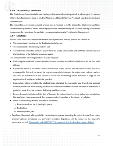 79%u2022No disciplinary sanctions may be imposed upon any student without following fair and due process.%u2022Each student has a duty to understand the rules and regulations set forth by the university. Ignorance of a rule or regulation shall not be an acceptable defense.%u2022Students shall maintain a record of good conduct and behavior at all times.%u2022Students shall respect all religions and beliefs and refrain from acting in any manner offensive to the religious and cultural sentiments of others.%u2022Students are prohibited from any behavior of radicalization, extremism and terrorism which adversely affects the university and either constitutes a criminal offense as defined by UAE law, or indicates that the student may present a danger or threat to thehealth or safety of the others.%u2022Students shall treat the faculty and staff of the university with due respect and maintain cordial and friendly relations with their colleagues and expect the same from others.%u2022Student Identity Cards (IDs) issued by the university will be worn at all times and must be clearly visible.%u2022Maximum of two students will be elected as Class Representatives under the supervision of the Year Coordinator. The Class Representatives duty is to raise all the academic/co-curricular/discipline issues of the class through the proper channels.%u2022Students shall regularly attend lectures, tutorials, clinics, examinations and all forms of academic activities in accordance with the university regulations.%u2022Students shall not be allowed to enter the class after the commencement of the class.%u2022Students shall maintain good conduct inside lecture halls, library, labs, hospitals, activity rooms, common areas and other places.%u2022Students shall be properly dressed during any academic, cultural, social or sport activities. Indecent or revealing clothes should not be worn.%u2022Students must not smoke anywhere in the university premises including labs, library, hospitals, and hostels or in the RAKMHSU buses.%u2022Students must not possess, make or consume alcohol or any prohibited drugs/substances, fire arms or any other harmful tools.%u2022Students should not use any audio and communication devices including radios, CD players and mobile phones in the classrooms.%u2022Consumption of food items including chewing gums in the classrooms/clinics/labs/library is not allowed.%u2022Sexually intimate behavior, sexual harassment, insulting or suggestive remarks are prohibited on the campus premises and inside the buses.%u2022Littering on the premises of the university, including classrooms and washrooms is prohibited.