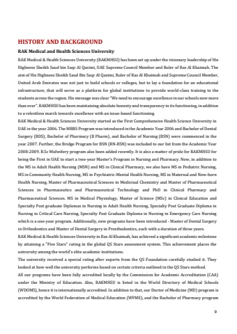 3Table of ContentsPresident's Message.....................................................................................................................................................8HISTORY AND BACKGROUND..................................................................................................................................9RAK Medical and Health Sciences University.............................................................................................91. UNIVERSITY VISION, MISSION AND CORE VALUES..................................................................................131.1 Vision................................................................................................................................................................131.2 Mission.............................................................................................................................................................131.3 Core Values.....................................................................................................................................................131.4 Strategic Goals and Objectives................................................................................................................132. COLLEGES AND DEPARTMENTS......................................................................................................................173. STUDENTS%u2019 RIGHTS AND RESPONSIBILITIES.............................................................................................183.1 Students%u2019 Rights and Responsibilities..................................................................................................183.2 Academic Freedom......................................................................................................................................183.3 Evaluation.......................................................................................................................................................183.4 Protection against improper disclosure.............................................................................................193.5 Freedom of speech and expression......................................................................................................193.6 Student Publications...................................................................................................................................193.6.1 Publications of Student Council....................................................................................................193.6.2Distribution of handbills, posters, pamphlets and other written material..................203.6.3Misuse of Cyberspace including Blogging.................................................................................203.6.4Student participation in university governance.....................................................................203.7 Student Records...........................................................................................................................................203.8 Student Attendance & Academic Regulations..................................................................................204. POLICIES FOR E-LEARNING...............................................................................................................................214.1 Introduction...................................................................................................................................................214.2 Scope.................................................................................................................................................................214.3 Definition........................................................................................................................................................214.4 University Standards for E-Learning...................................................................................................214.5 E-Learning Courses.....................................................................................................................................224.6 E-Learning Delivery....................................................................................................................................224.7 E-Learning Academic Services ...............................................................................................................224.8 E-Learning Academic Integrity...............................................................................................................234.9 Special Clause................................................................................................................................................23